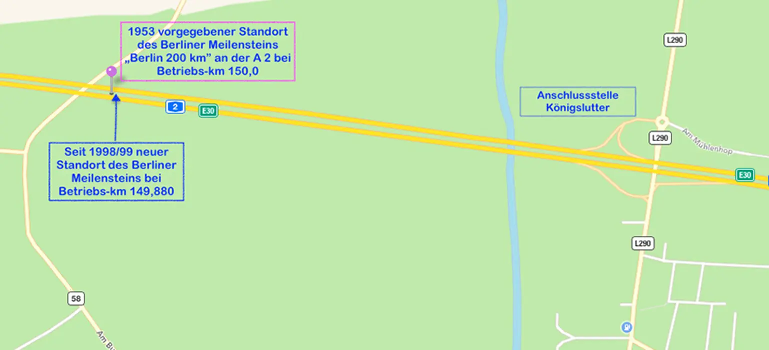 Laut Mitteilung vom Juni 2017 hat die zuständige Autobahnmeisterei Braunschweig-Hafen den Berliner Stein beim Ausbau der A2 im Mittelstreifen westlich der Anschlussstelle Königslutter/östlich von Bauwerk 132 (Überführung über die Kreisstraße 6) bei Betriebs-km 150,0 gefunden. Der Stein wurde vor den Ausbauarbeiten geborgen und dann 1998 oder 1999 fast am gleichen Standort im überbreiten Mittelstreifen (am Betriebs-km 149,880) wieder aufgestellt. Der Stein sollte dahin, wo er vorher gestanden hat, natürlich angepasst an die neue Situation.